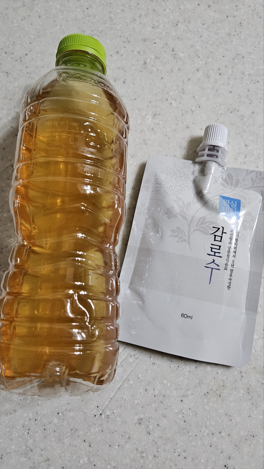 500ml 생수병의 물을 조금 마시고 나서 그곳에 감로수 한팩을 넣어준다. 그리고 그 팩에도 물을 조금 넣어 헹궈서 마셨다. 임금님이 드시던 귀한 것이니까^^ 맛은 매실주스맛에 거의 80프로 가깝다. 20프로는 약간 배즙냄새, 대추를 우린 냄새가 나는 것 같기도 하고 아주 살짝 한약냄새가 나는 것 같기도 하다. 나에게는 전혀 거부감 없이 맛있게 느껴진다.