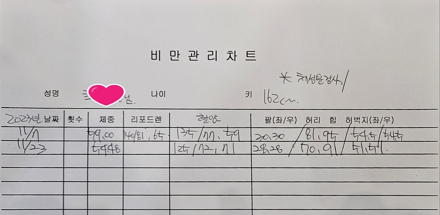 모든 지수가 좋아진 것을 확인할 수 있었고, 가장 놀라웠던 건 허리가 81에서 70으로 줄었다는 사실. 치수 재시는 선생님께서 올인원 입었냐고 물어보시더라. ㅎㅎㅎ 그런 건 생전에 입어본 적이 없어요.. 허벅지둘레도 팔뚝 둘레도 다 줄었다.