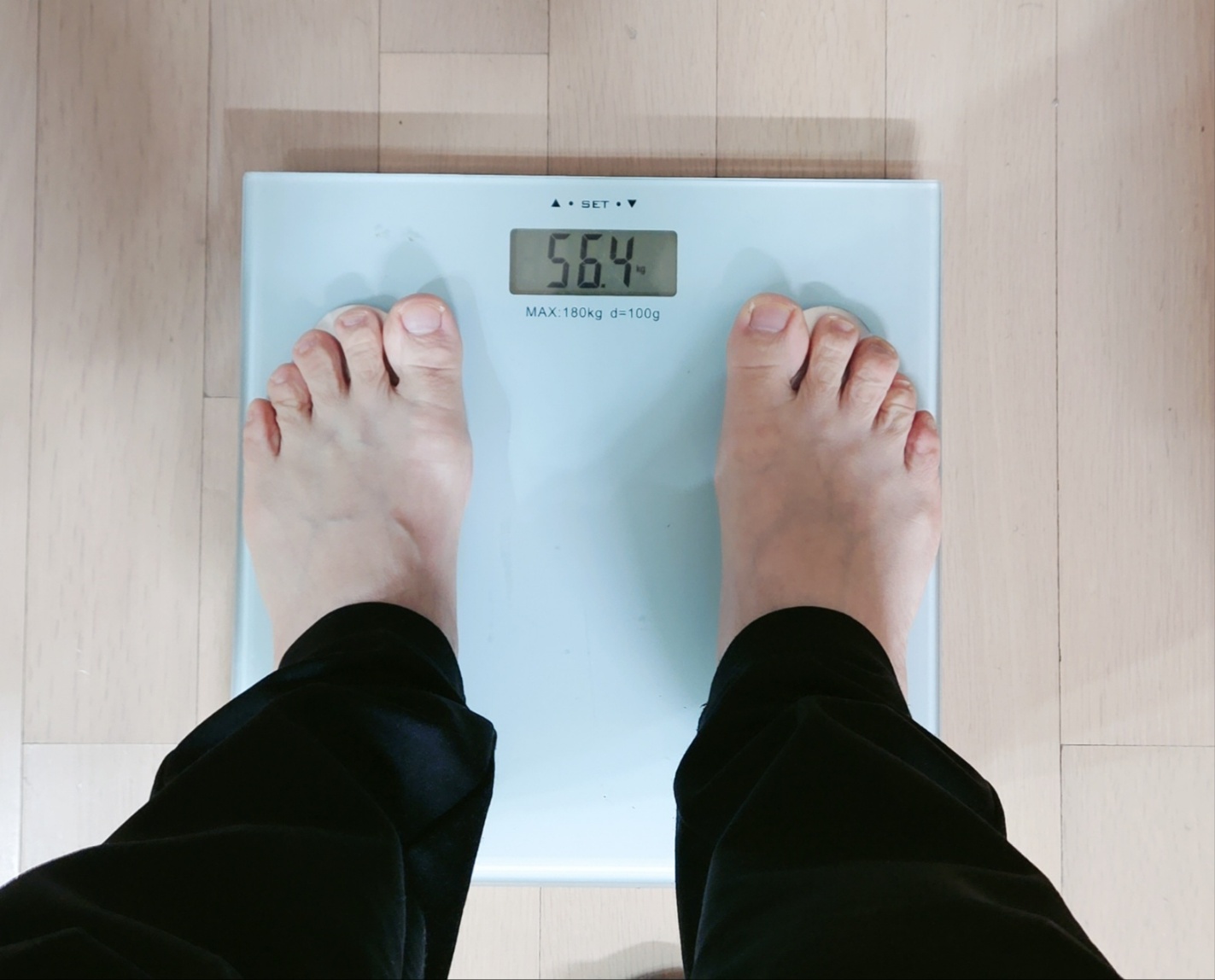 (58.3kg--> 57.4kg--> 56.8kg--> 56.4kg)