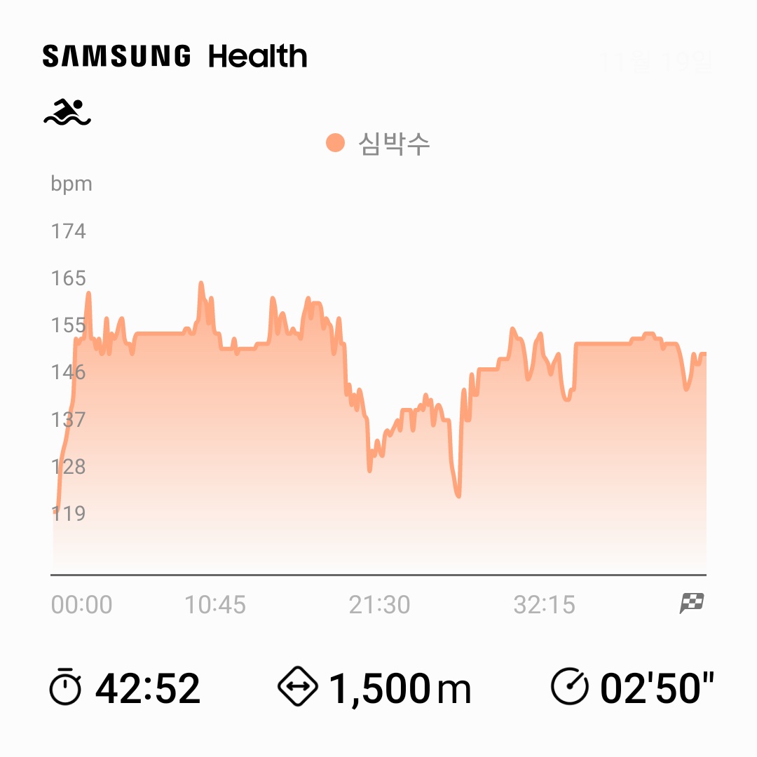 유산소운동 : 수영 40분 (1.5km - 25m 레인 30바퀴)