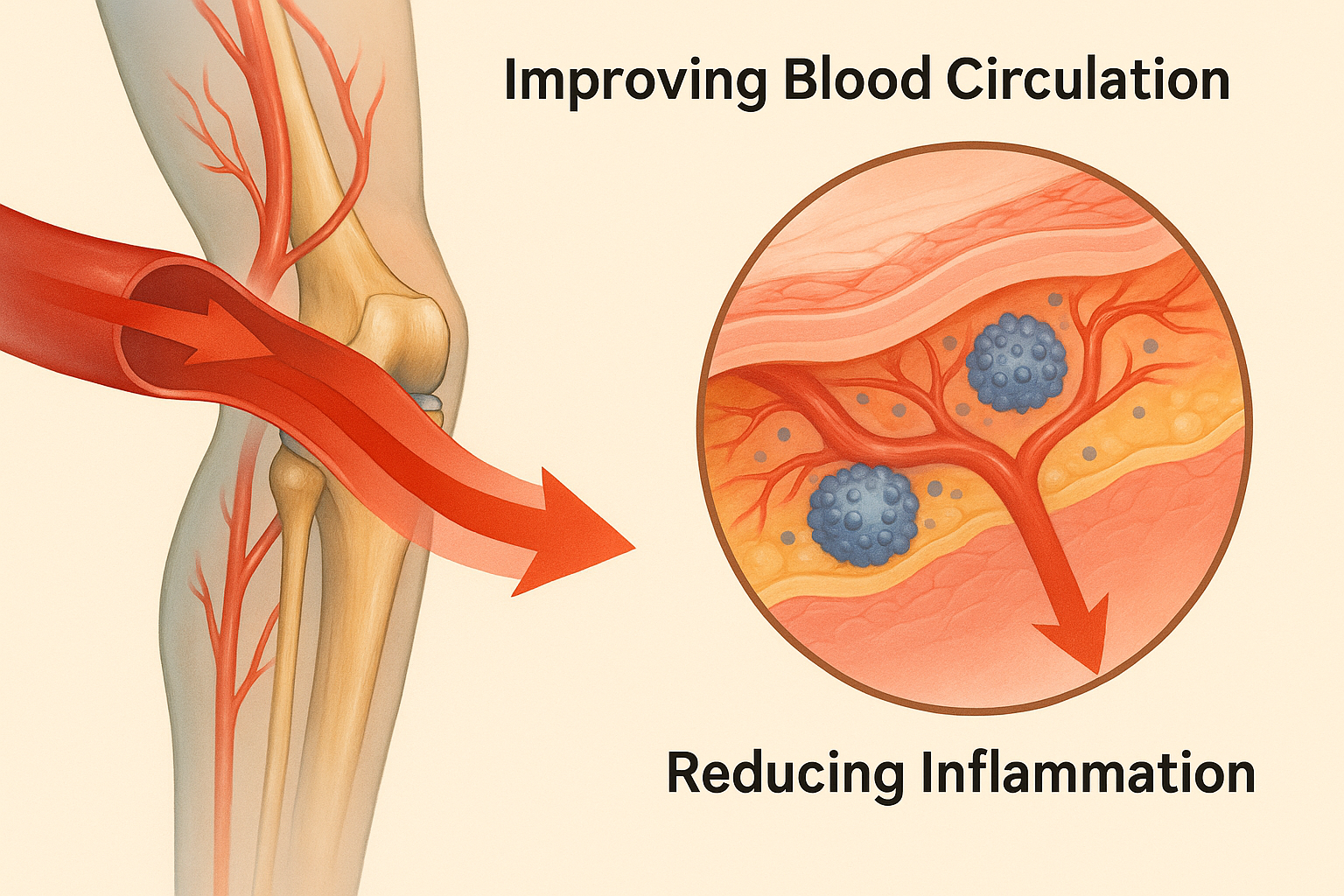 - 혈류개선 → 산화질소가 혈관을 넓혀 관절 주변 모세혈관 순환을 개선