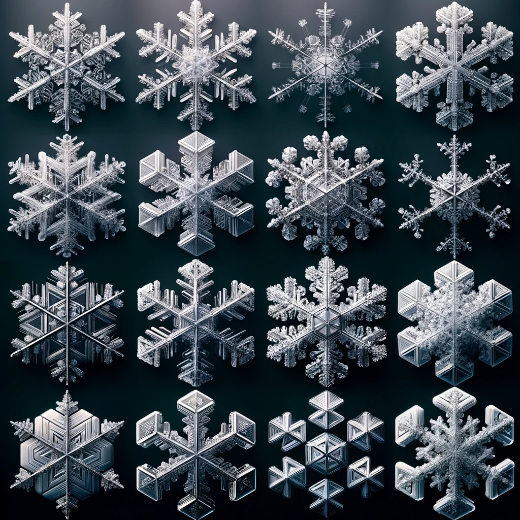 눈결정은 기본적으로 육각형 구조를 가지고 있지만, 그 세부 모양은 형성 환경에 따라 크게 달라집니다. 눈이 내리는 동안 겪는 대기의 여러 층과 그곳의 온도, 습도 조건은 눈결정의 성장과 최종 형태에 영향을 미칩니다. 따라서 기본적인 눈결정의 육각형 구조 외에도 다양한 양식의 눈송이들이 존재합니다. 겉보기에는 비슷해 보일 수 있는 이 눈송이들의 미세한 차이들이 쌓인 눈의 전반적인 성질과 놀이 시의 적합성을 결정하게 됩니다. 예를 들어, 잘 뭉쳐진 눈은 크고 묵직한 육각형 눈결정으로 이루어졌을 가능성이 높고, 잘 안 뭉쳐지는 눈은 더 작고, 섬세하며 별 모양의 복잡한 구조를 가진 눈결정이 많을 것입니다.