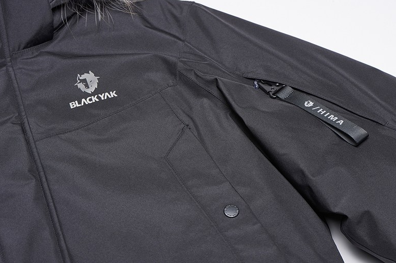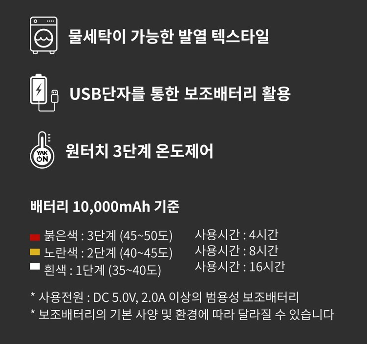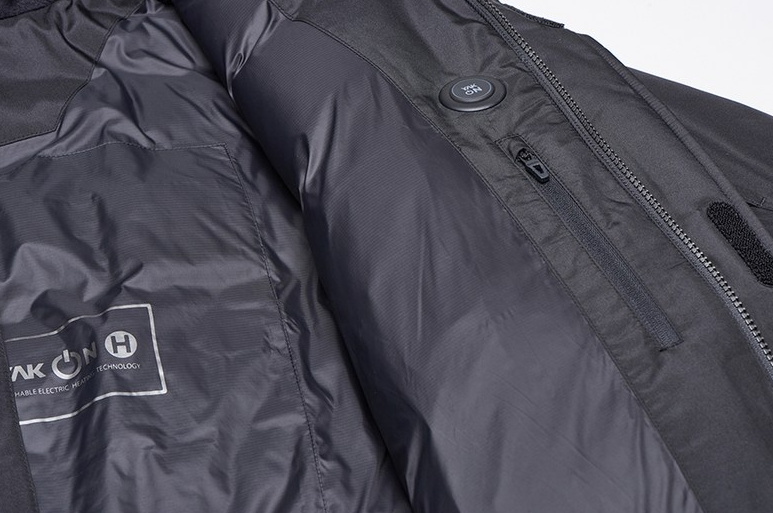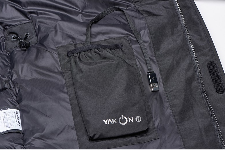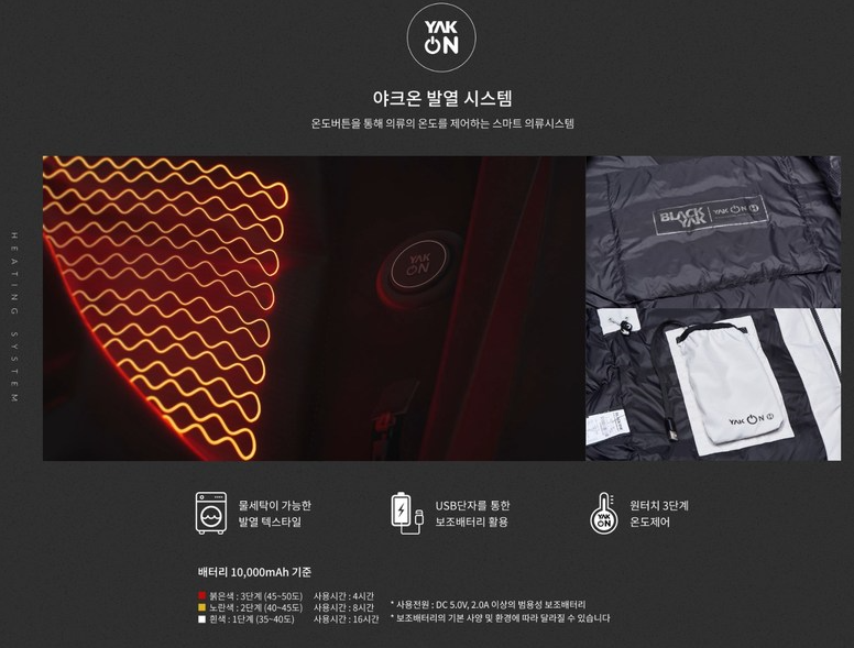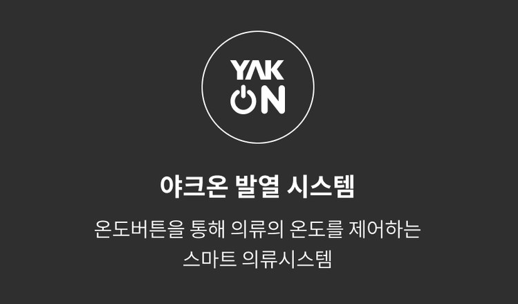블랙야크가 개발한 야크온은 왼쪽 가슴 안쪽에 발열(야크온) 스위치가 위치하여, 발열판 작동이 가능하며, 안사양에는 핸드폰 충전용 보조배터리(디바이스) 전용 포켓과 발열판 및 커넥터가 위치하여 극강의 보온성을 제공한다.