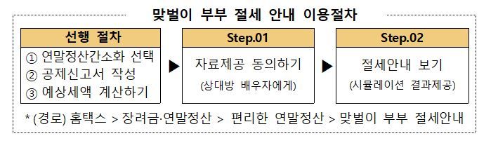 - 맞벌이 부부 절세 정보 제공: 맞벌이 부부는 18일부터 제공되는 서비스를 통해 부양가족 공제 조합을 시뮬레이션하고 최적의 세금 조합을 선택할 수 있습니다.