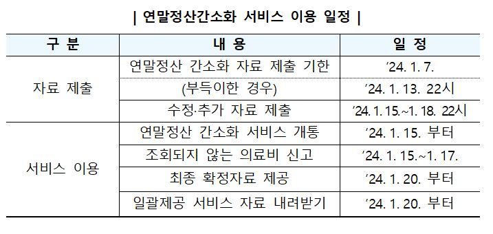 - 의료비 신고 및 최종 자료 확인: 간소화 서비스에서 조회되지 않는 의료비는 신고센터를 통해 신고할 수 있으며, 추가 제출·수정 자료는 20일부터 확인 가능합니다.